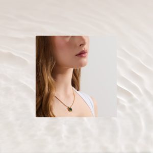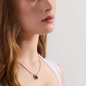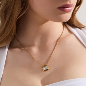 Elevate your look with the Ethereal Necklace. featuring a stunning cushion-cut crystal set in a sleek gold bezel. suspended from a smooth snake chain. It’s the perfect blend of modern minimalism and luminous glamour.